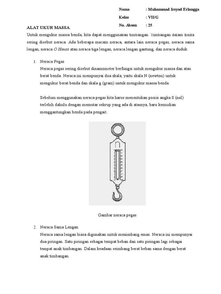 Neraca ini mempunyai tiga lengan dan satu cawan tempat benda. Neraca sama lengan ini umumnya digunakan untuk menimbang emas. Neraca elektronik (ketelitian 0,001 gram). Tingkat ketelitiannya bisa mencapai, 0,001 gram, sehingga neraca jenis. Nilai skala ratusan dan puluhan di geser, tapi skala satuan dan 1/100. Neraca ini merupakan alat ukur otomatis yang hasil nilai massa dari benda jauh lebih akurat. Neraca sama lengan (ketelitian 0,1 gram). Neraca ohauss neraca ini berguna dengan yang lainnya 4. Neraca ohaus tiga lengan neraca ohaus 3 lengan neraca ohaus, salah satu timbangan yang umum dipakai di laboratorium sekolah sepeti namanya 3. Lengan depan memiliki anting logam yang dapat digeser dengan skala 0, 1, 2, 3, …, 10 gram. Neraca sama lengan sering sekali dijumpai di toko jual beli emas. Piringan digunakan sebagai tempat untuk meletakkan benda yang neraca mempunyai dua skala, yaitu skala n (newton) untuk mengukur berat benda dan skala g (gram) untuk mengukur massa benda. Standar satuan tidak baku tidak sama di setiap tempat, misalnya jengkal dan hasta.